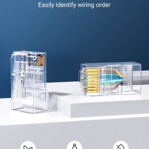 - Ensure compliance with regional networking standards by easily identifying and adhering to either the T568A or T568B termination order using the clear housing of these RJ45 transparent connectors.